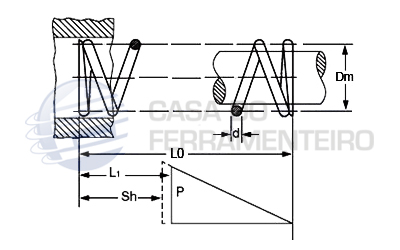 | Código | d (mm) | Dm (mm) | L0 (mm) | L1 (mm) | P1 (kgf) | C (kgf/mm) | Øeixo (mm) | Øfuro (mm) | Material | Disponibilidade |