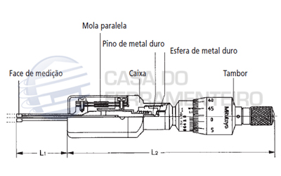 | Código | Ref. Mitutoyo | Capacidade (mm) | Resolução (mm) | Exatidão (mm) | L1 (mm) | L2 (mm) | Composição | Disponibilidade |